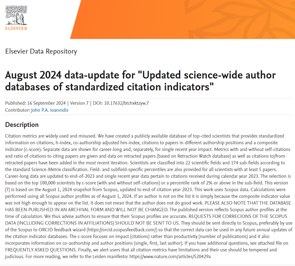 2024年9月16日,全球最大学术出版商Elsevier和美国斯坦福大学共同公布新一期世界“标准化引文指标全科学作者数据库”(Updated science-wide author databases of standardized citation indicators,截止到2024年8月1日),即全球前2%的全科科学家职业生涯影响力(Career-long impact)排名数据库(共计217,097人,最早统计数据自1834年始)和单年度影响力(Single year impact)排名数据库(共计223,152人)
