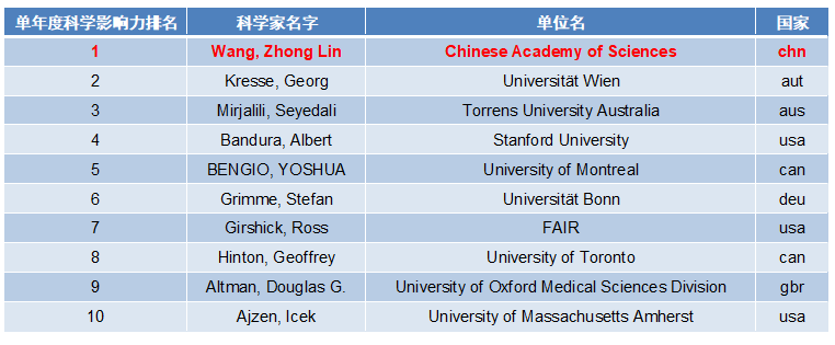 在年度排名——单年度科学影响力排名方面,王中林院士排名第1,自2020年以来已陆续在5年保持年度排名第1位。